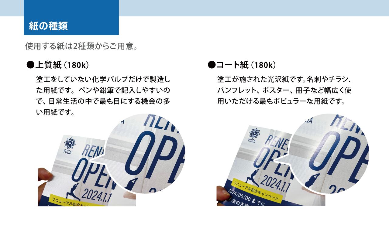 塗工が施された光沢紙です。名刺やチラシ、パンフレット、ポスター、冊子など幅広く使用いただける最もポピュラーな用紙です。